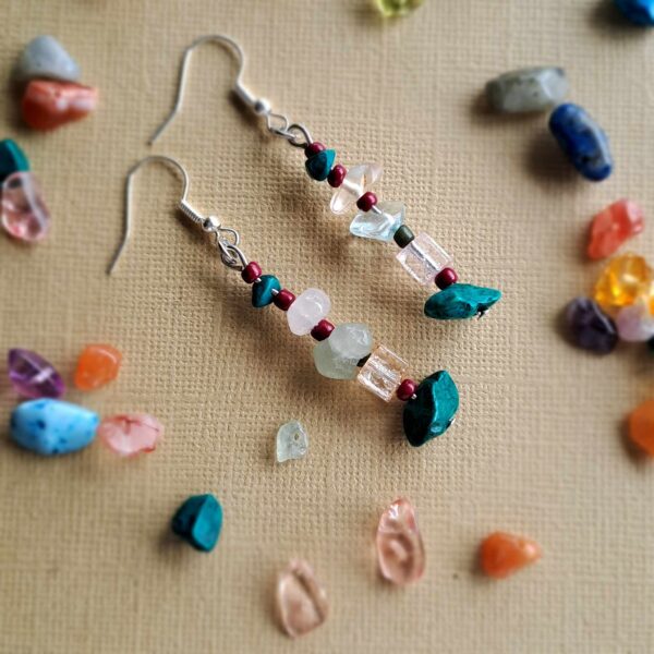 Wow, check out these gorgeous gem and bead earrings on a silver standard hook! They are absolutely stunning and I can’t help but feel so excited about them. The vibrant teal and burgundy color of the gems combined with the intricate details of the beads make for an eye-catching accessory that will definitely elevate any outfit. Just imagine wearing these beauties and feeling like a true fashionista! Whether it’s for a special occasion or just to add a pop of color to your everyday style, these earrings are sure to bring a sense of excitement and glamour. Don’t miss out on this fabulous find – get ready to shine with these incredible gem and bead earrings on a silver stand hook!